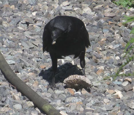 This summer, I’ve noticed with great relief that there are far fewer wasps nests in the yard. Actually, the only ones left are a sprinkling of small ones. Until I saw the crow at work, I didn’t realize why our wasp population had dropped so dramatically.