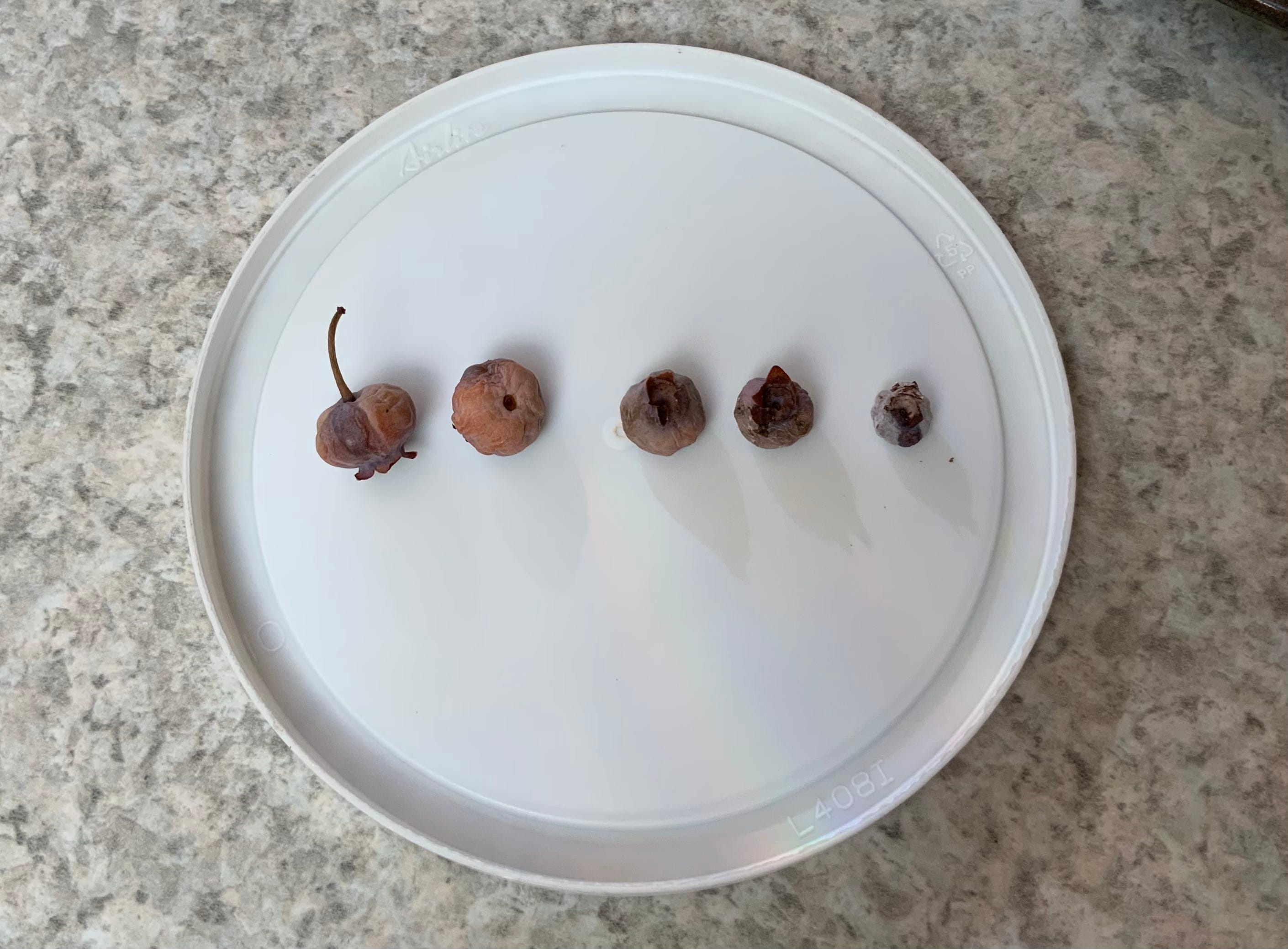 That’s a fungal illness that makes berries turn a sickly pink, then shrivel up into little gray bits—they really do look like little mummies.